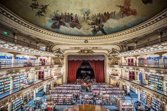 يجد المسرح المهجور حياة جديدة كمحل لبيع الكتب الصاخب: هذا مثال ملهم للتنمية الحضرية يتم بشكل صحيح. يقع متجر الكتب في أعماق مدينة بوينس آيرس الداخلية، وهو الآن مكان شهير للاسترخاء والاستمتاع بالقهوة والنقر على صفحات الكتب القديمة والحديثة - وهو بلا شك - أحد أجمل المكتبات في العالم.