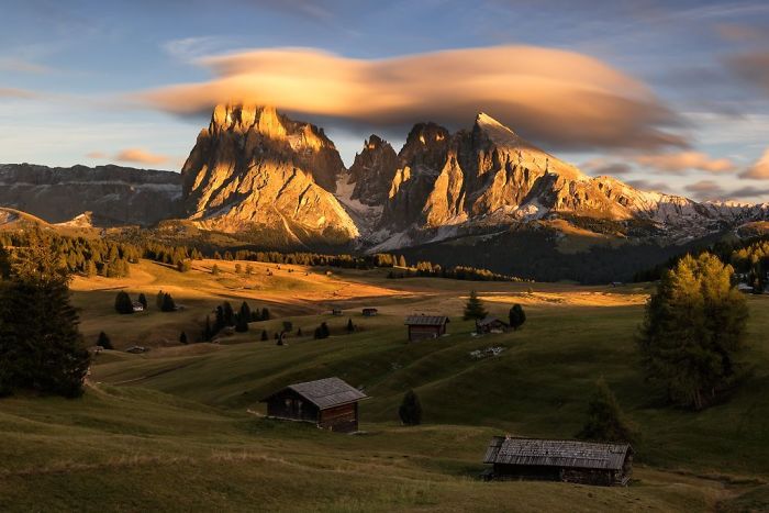 الغروب في المروج الألبية في الدولوميت، إيطاليا. اضطررت إلى ركوب 5 كيلو مترات شاقة من الفندق لالتقاط غروب الشمس، حيث عرفت في اللحظة الأخيرة أنه لم يُسمح للزائرين بالقيادة في هذه المنطقة المحمية، لكن الأمر كان يستحق ذلك.