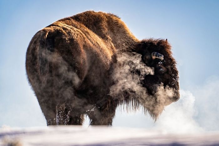 تكون الأيام أقصر بكثير في فصل الشتاء وتبدأ الارتفاعات المختلفة داخل منتزه يلوستون الوطني حتى غروب الشمس في وقت مبكر. مع إغلاق المساء وتراجع درجات الحرارة، قطعت قطيع من البيسون صعودًا وفوق تلة مجمدة بحثًا عن الوجبة التالية. عندما شاهدت المجموعة تتلاشى بعيدًا عن الأنظار، تم إيقاف البيسون الأخير في الطابور مؤقتًا، والعودة في اتجاهاتي، واستنشق الزفير، وخلق سحابة كثيفة من البخار قبل المتابعة فوق التل وبعيدًا عن الآخرين.