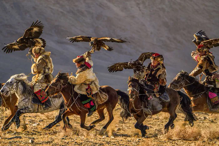 المشاركون في مهرجان النسر الذهبي السنوي، اظهار مهاراتهم. يقام المهرجان في بيان-أولجي إيداج، غرب منغوليا. يحتفل الصيادون النسر بتراثهم الكازاخستاني ويتنافسون على صيد الحيوانات الصغيرة مثل الأرانب والثعالب. يمارس صيد النسر في آسيا الوسطى منذ آلاف السنين، على الرغم من أنه يتم الحفاظ عليه في الوقت الحاضر فقط في الثقافة الكازاخستانية حيث لا تزال التقاليد حية ومحفوظة بشكل جيد.